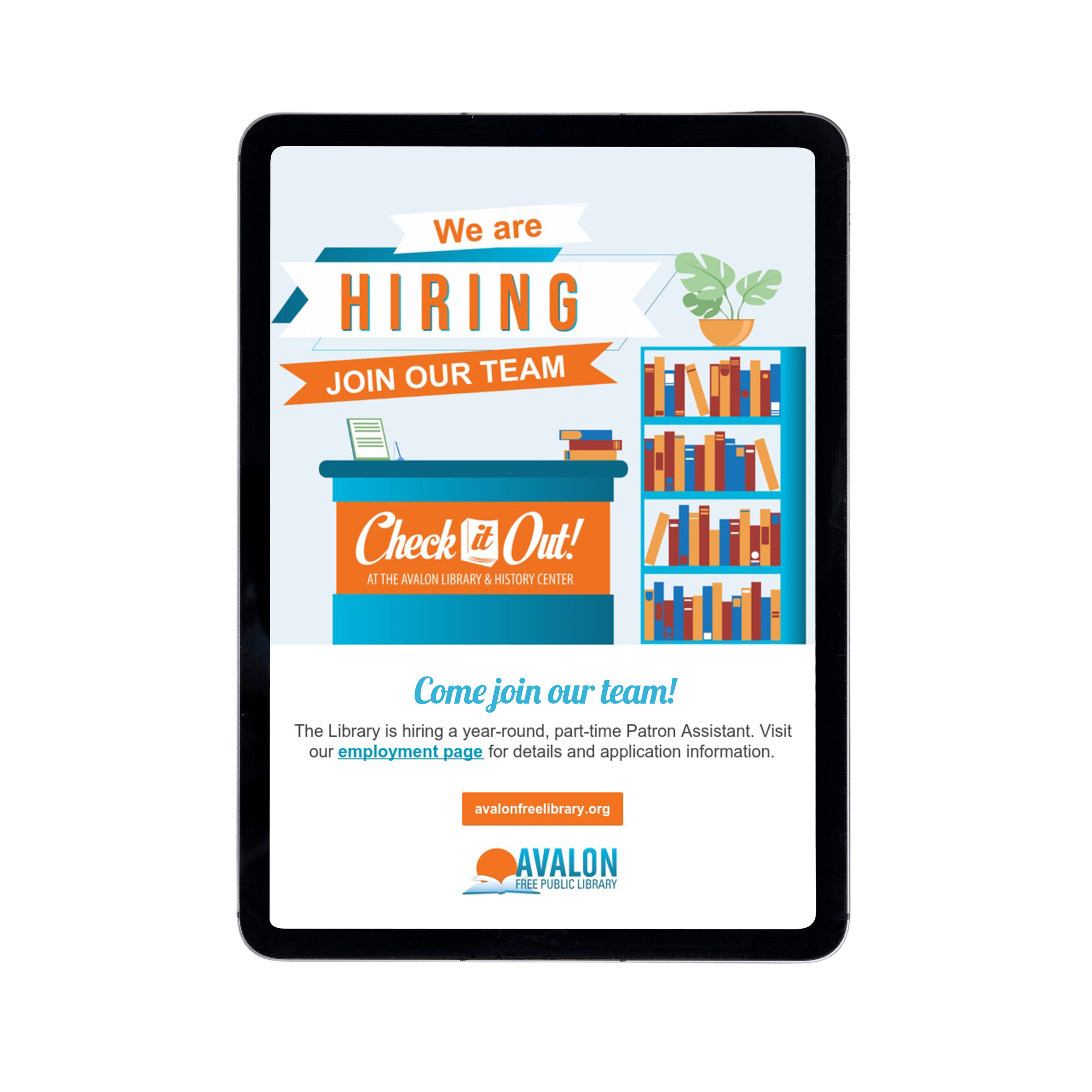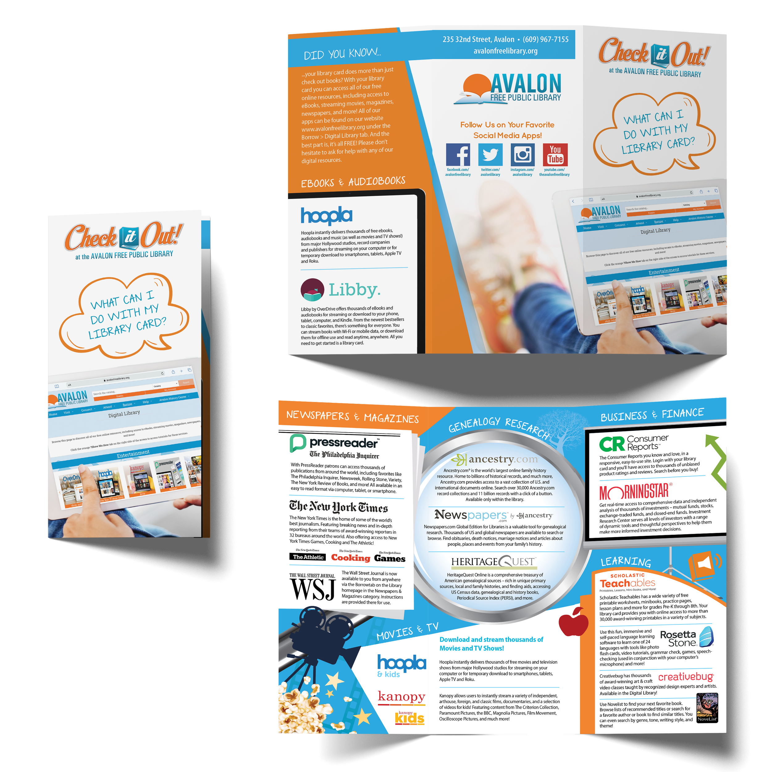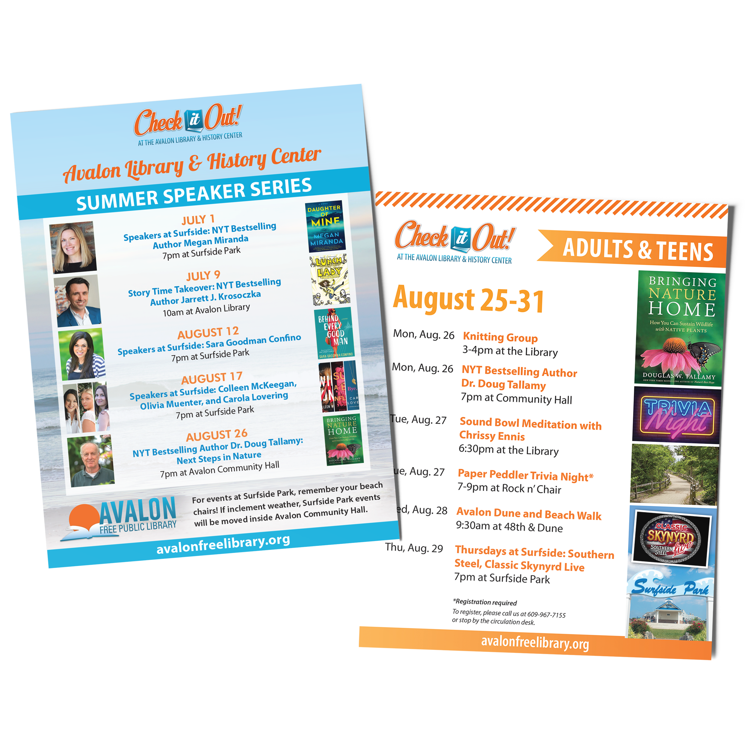 Designed the current “Check It Out” brand campaign for the Avalon Free Public Library and Avalon History Center, which serves as an invitation for patrons to explore beyond the realm of ‘books’ and discover their expansive range of programs, services, and innovative technology. Used in a diverse media mix encompassing print, digital, social media, in-house displays and exhibits, and promotional items.